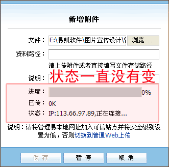 第三種情況:可信站點及安全性已經按照前兩種情況做了設置,但仍然不能上傳文件,進度一直為0%,如下圖所示:
