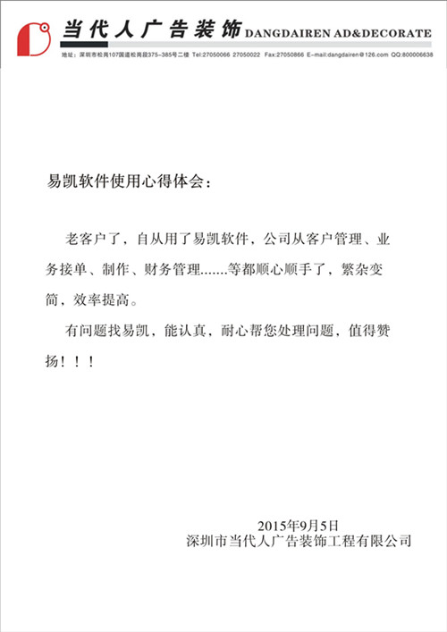 當代人廣告謝經理發表了應用廣告公司財務管理軟件-管理易的心得體會:“ 老客戶了,自從用了易凱軟件,公司從客戶管理、業務接單、製作、財務管理等都順心順手了,繁雜變簡單、效率提高。 有問題找易凱,能認真、耐心幫您處理問題,值得讚揚!”