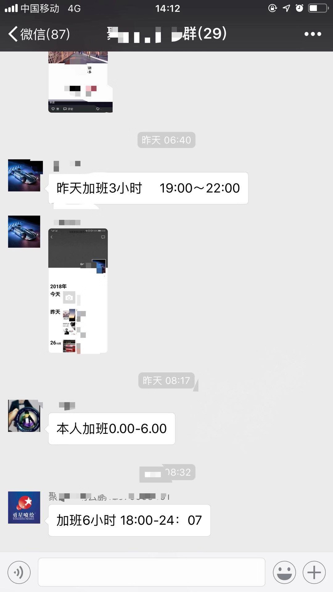 下麵我也把我們這個平常每天公司的這個加班的一些情況,包括他們加班的一些時間段,我也在我們群裏麵也截了個圖。