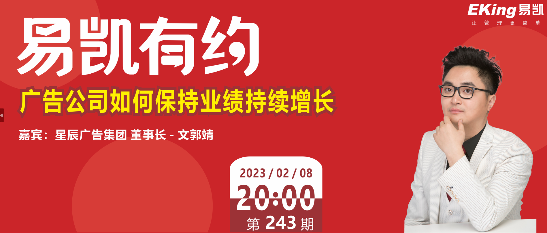 2023年2月8日《周三晚8點-易凱有約》第243期由廣東星辰廣告集團董事長--文郭靖文總在視頻號“易凱軟件”直播分享,分享主題:廣告公司如何保持業績持續增長。 ...