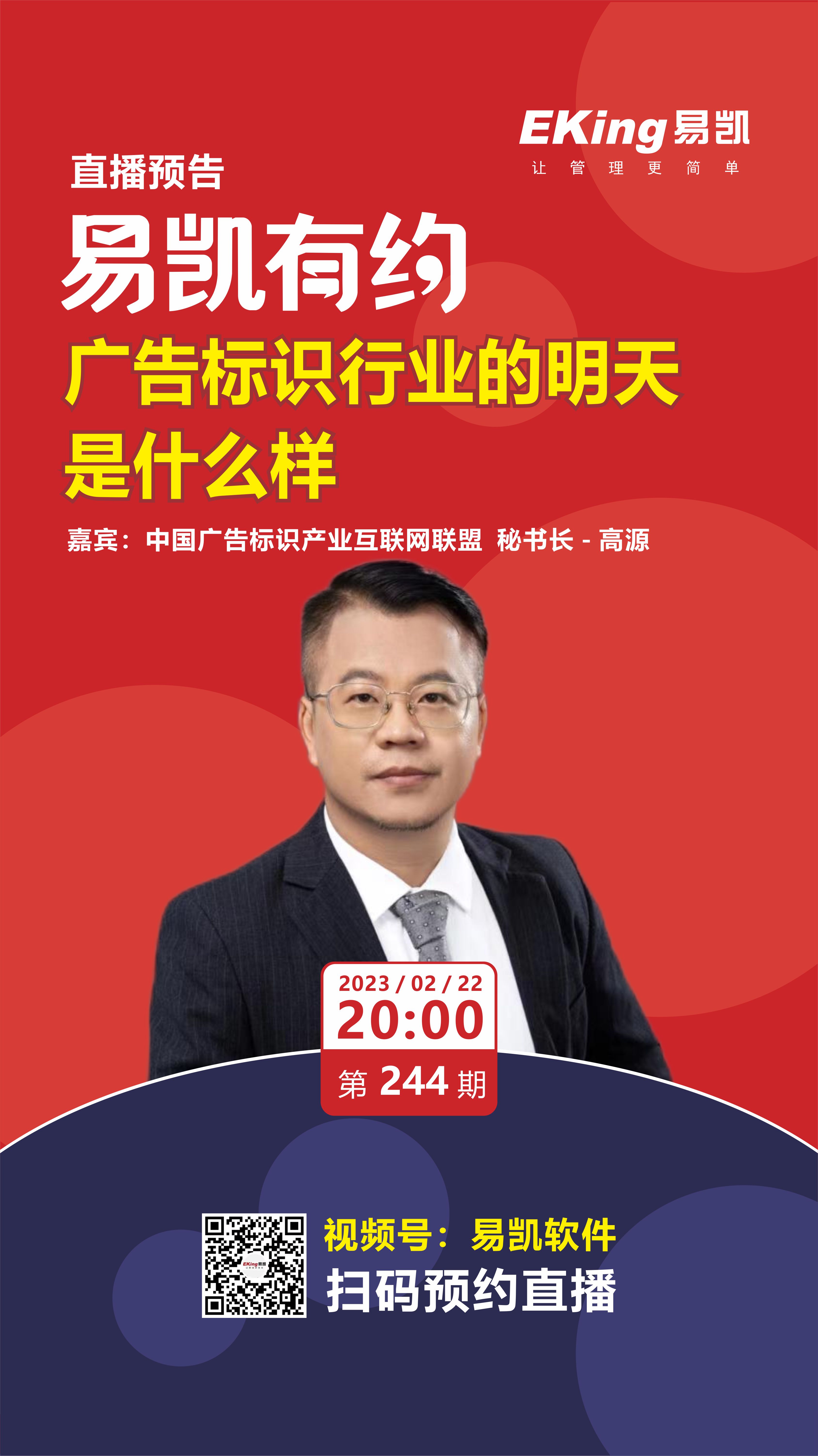 2023年2月22日《周三晚8點-易凱有約》第244期由中國廣告標識產業互聯網聯盟 秘書長 - 高源 高總在視頻號“易凱軟件”直播分享,分享主題:廣告標識行業的明天是什麼樣?