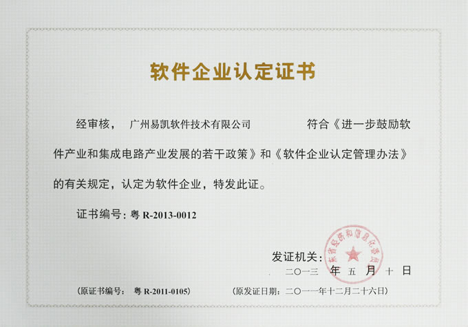 2011年12月26日,廣州易凱軟件技術有限公司經廣東省經濟和信息化委員會正式認定為“雙軟企業認定企業”,獲得了由廣東省經濟和信息化委員會正式頒發的《軟件企業認定證書》和《軟件產品登記證書》。