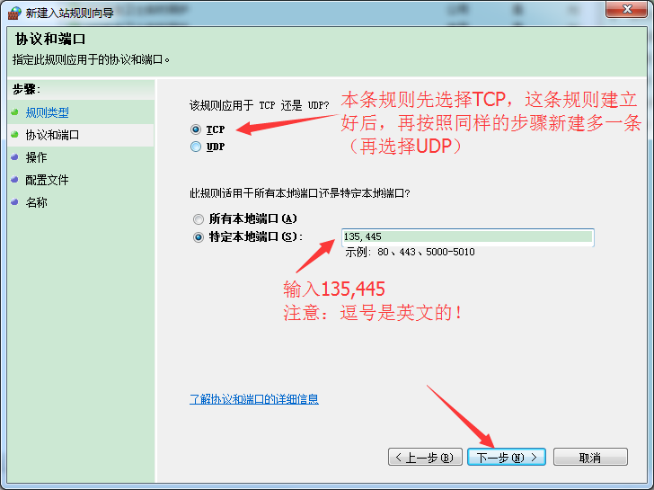 本條規則先選擇TCP,等會再按照同樣的步驟建立多一條規則(選擇UDP)