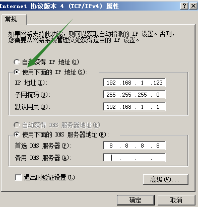 選擇使用下麵的ip地址,手工錄入ip和網關,dns