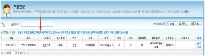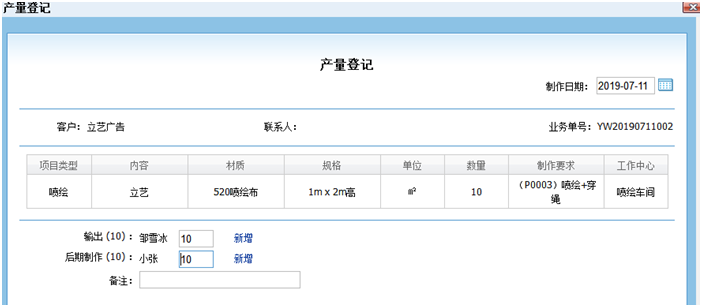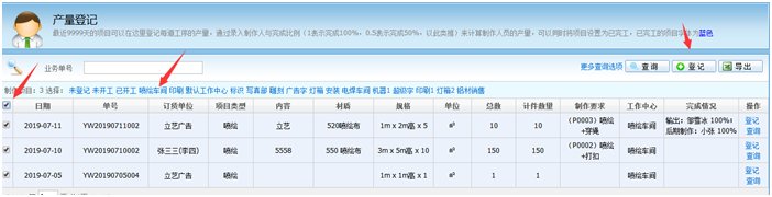 2、設置好了計件單價,我們進行產量登記,係統就會自動按產量乘以計件單價得出產值,可以進入製作--產量登記,我們選擇噴繪車間的訂單來進行產量登記