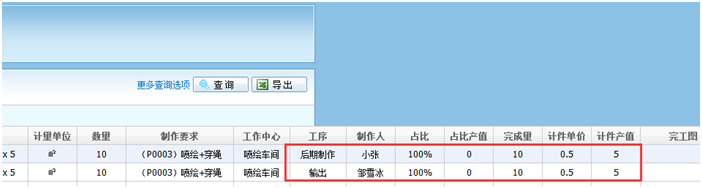 3、登記產量之後,係統會自動產生計件產值,可以進入製作--產量計件明細表查看,這裏就會計算出製作人員的產值
